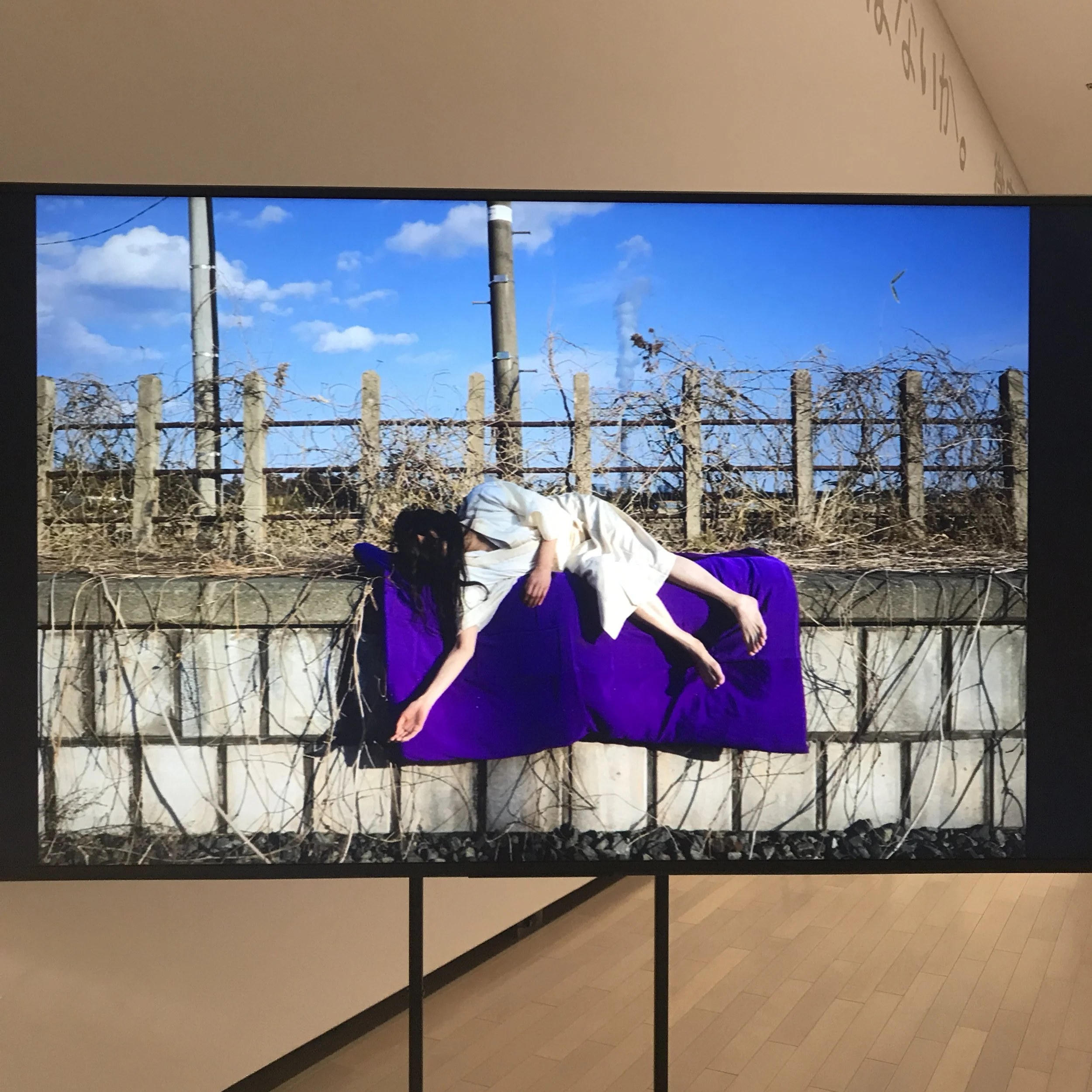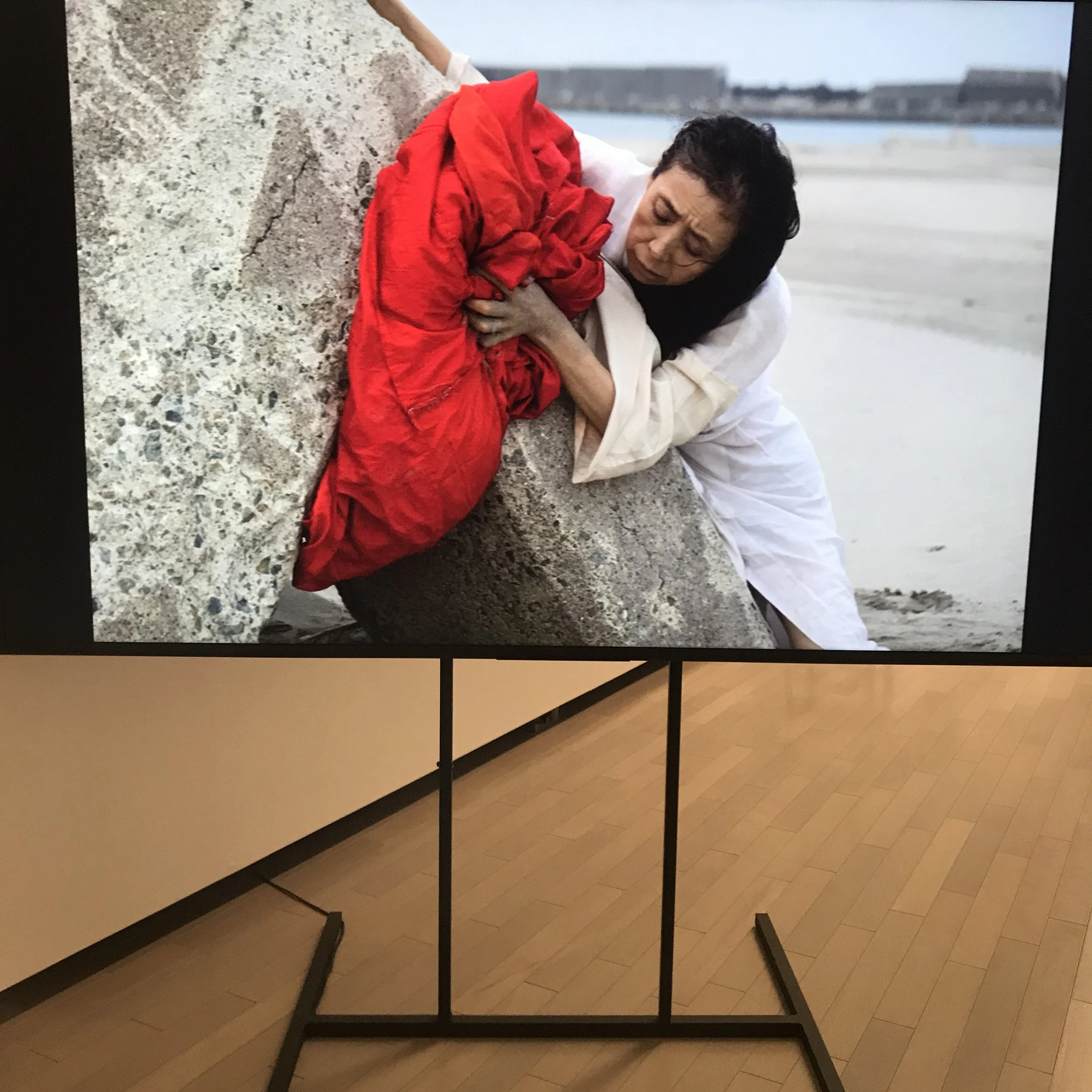 Eine andere sehr berührende Arbeit ist von Eiko Otake. Die in New York lebende Performancekünstlerin hat Fukushima mehrfach nach der Katastrophe besucht. Begleitet wurde sie von einem Fotographen, der ihre Aktionen im verseuchten Gebiet fotografisch festhielt. Das Material wurde dann zum Film montiert. Unterlegt wurden sparsam eingesetzte Infos.
