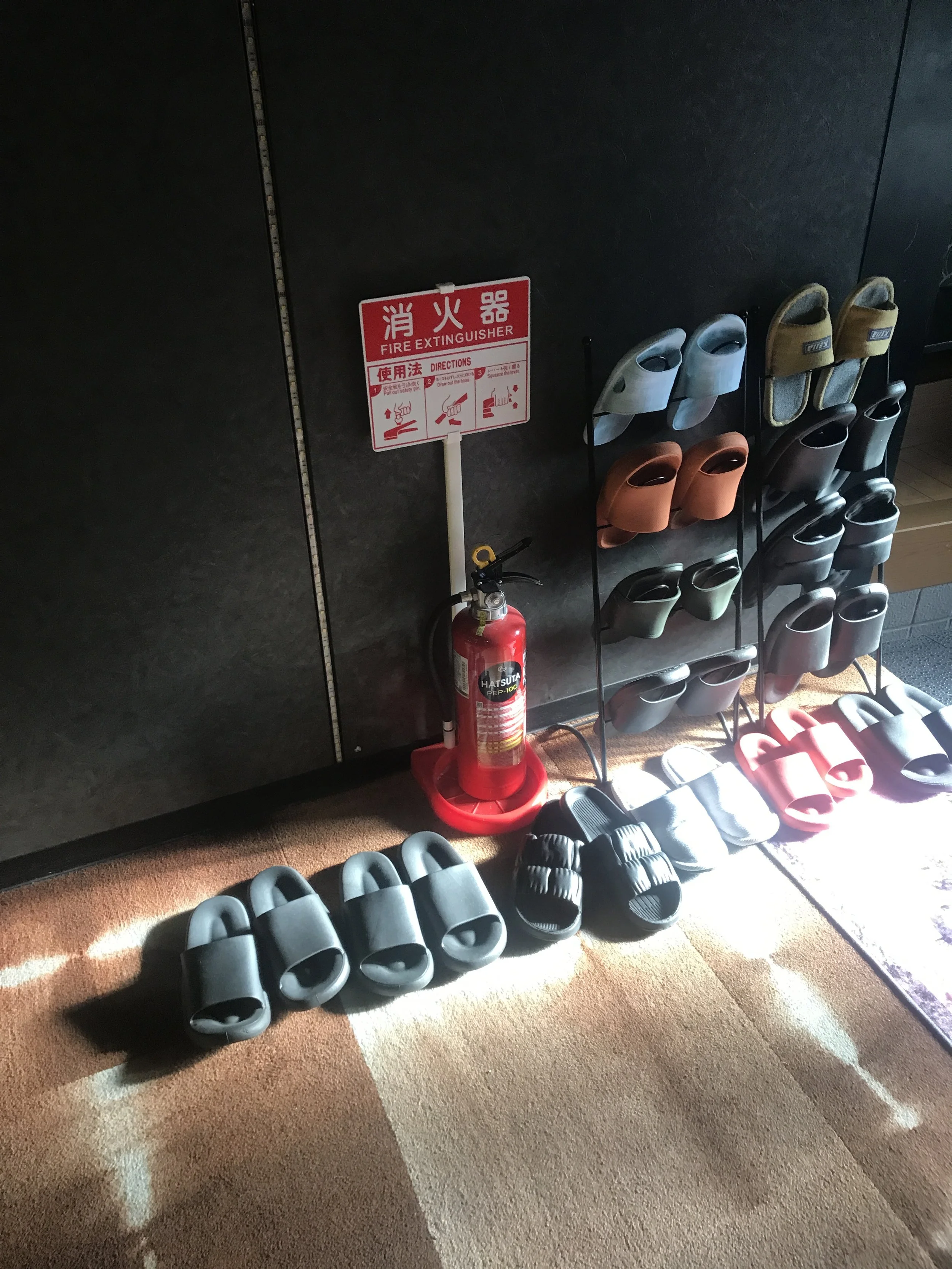 Nur in der Autobahnraststätte muss man beim Gang zur Toilette die Schuhe nicht wechseln. Ansonsten wechselt der Japaner seine Schuhe nahezu immer beim Betreten eines Privathauses und vielfach auch beim Restaurantbesuch. Überall stehen im Eingangsbereich Regale, in die man die eigenen Schuhe stellt. Dann betritt man über eine kleine Stufe den Innenbereich. In Hotels und Gasthäusern stehen Slipper bereit. In guten Unterkünften sind die entsprechenden Schuhe sogar in ‚desinfiziert‘ und ‚getragen‘ sortiert.