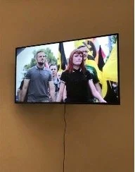Die Eindringlichkeit, mit der das geschieht, hat bei mir zu der oben beschriebenen Reaktion geführt. Da gibt es zum Beispiel mehrere Videos von Tomas Rafa. Rafa dokumentiert seit 2009 politische Proteste in Europa. Auf der Triennale hier sind von ihm z.B. ein Beitrag zu Anti-Rechts-Demonstrationen in Dresden, ein Video über eine Veranstaltung, die sich gegen Roma richtete oder auch eine Dokumentation einer Aktion gegen Flüchtlinge zu sehen. Zu den bedrückenden Bildern der Auseinandersetzung z.B. zwischen den Neo-Nazis und der Polizei in Dresden, kommt der laute Ton der skandierendem Meute, die jede Ecke des Ausstellungsraumes füllt.